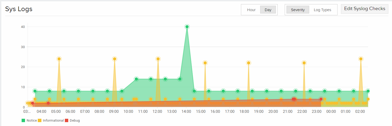 Get ample amount of data laid out in a graphical format detailing downtime, performance drops, and security infringements. Detailed metrics on logging program messages and process severity can be extrapolated from the Syslogs graph.