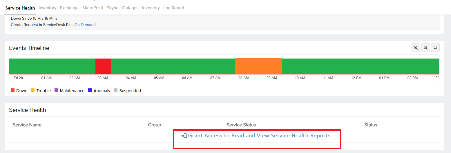 In case you do not see data under the Service Health tab, click on Grant Access to Read and View Service Health Reports to authorize Site24x7 to read data from your Microsoft 365 account. Learn more.