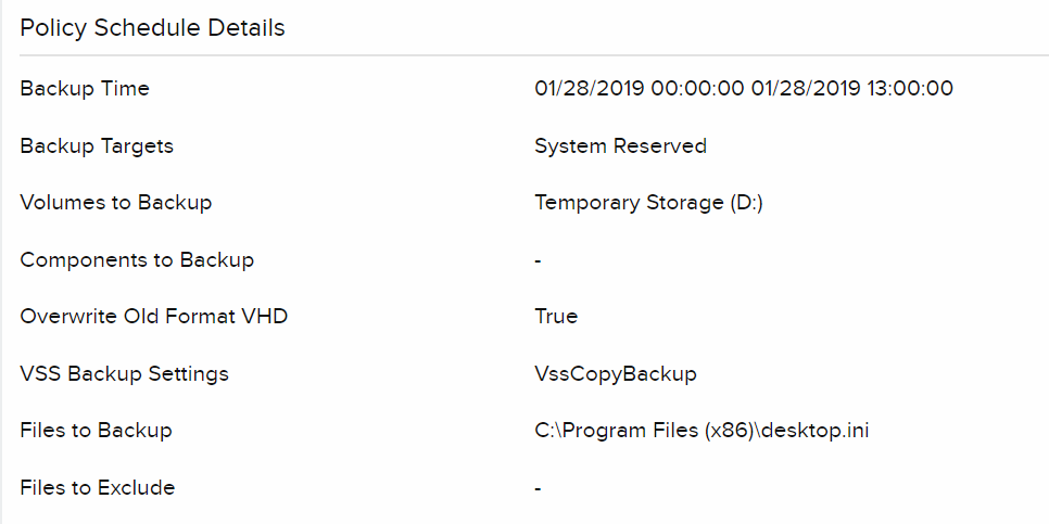 | VSS Backup Settings | Specify either a VSS full backup or VSS copy backup |