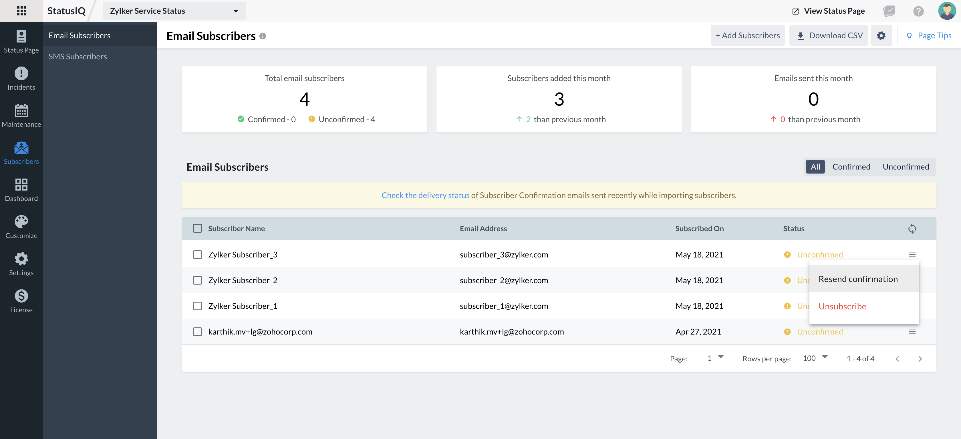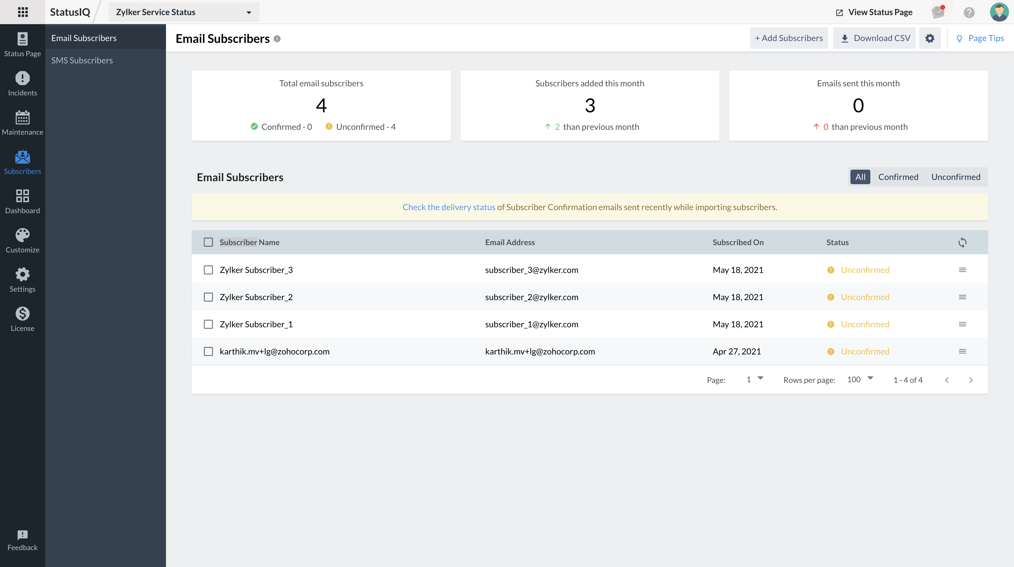 Add multiple subscribers to your mailing list by importing subscriber email IDs in the CSV format. Subscribers to the status page will receive real-time notifications about incidents and maintenance from StatusIQ.