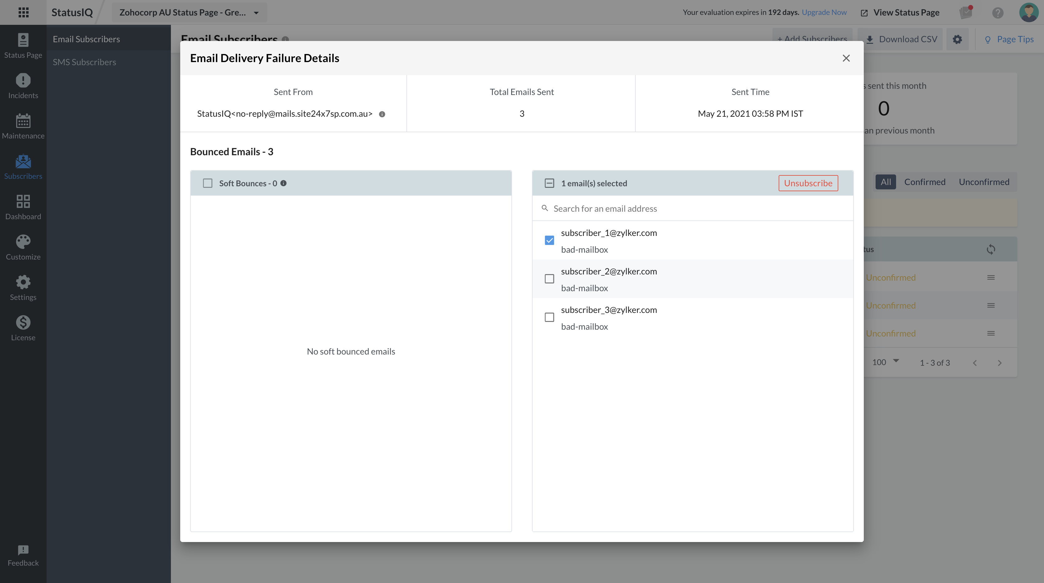 In case of a hard bounce, you can select the subscriber email IDs and click unsubscribe to remove them from the mailing list.