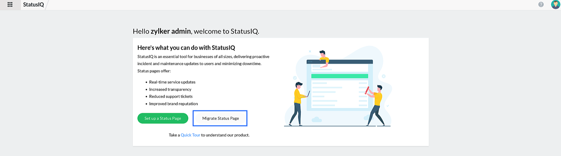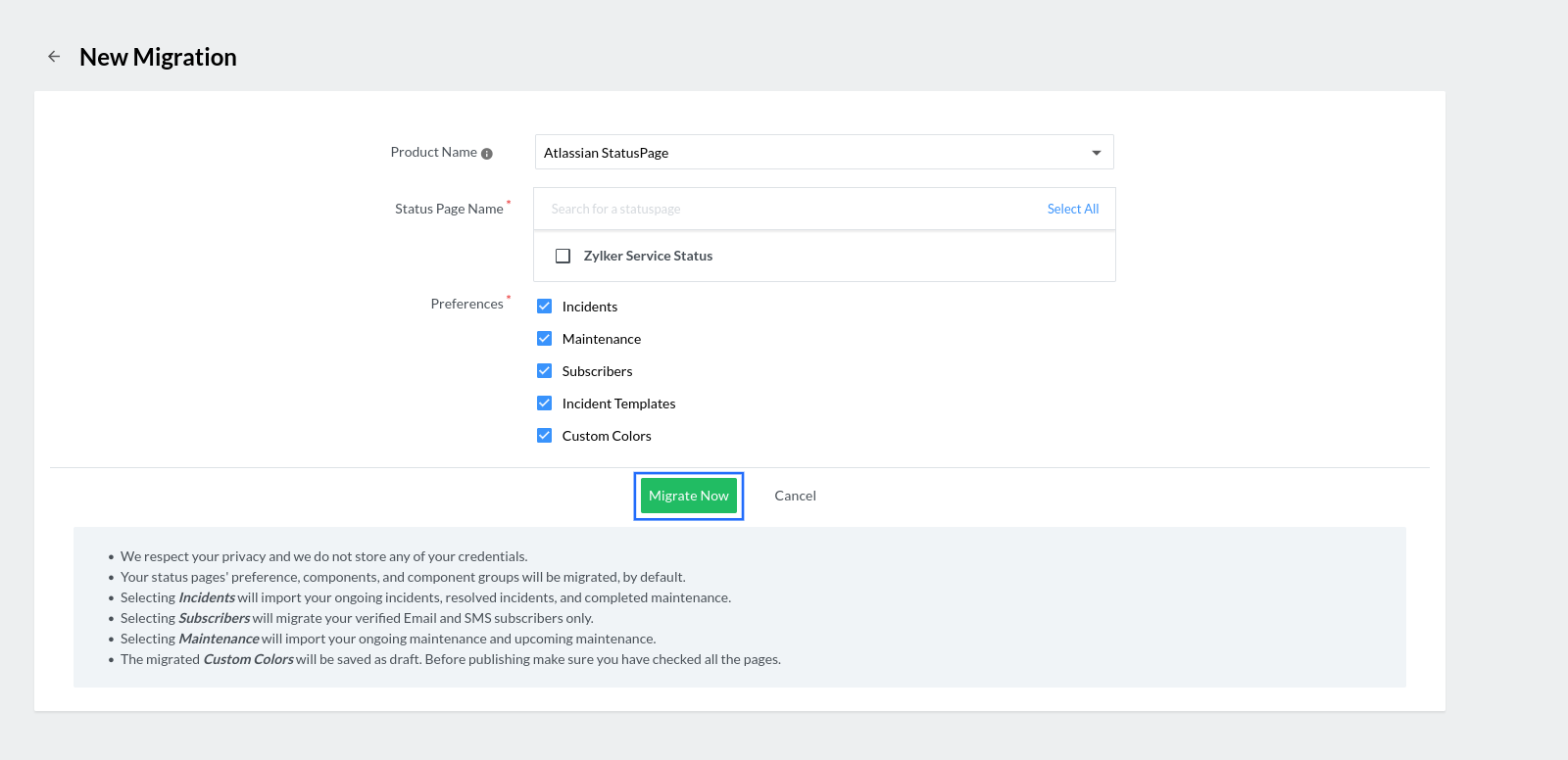 2. On the introduction page, click Migrate Status Page to start the migration process.