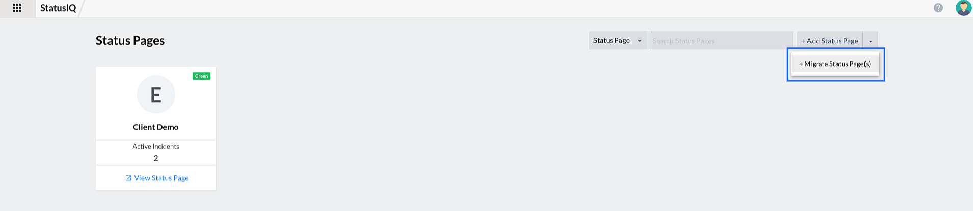 2. Click the + Add Status Page drop-down in the top-right corner of the page and select + Migrate Status Pages.