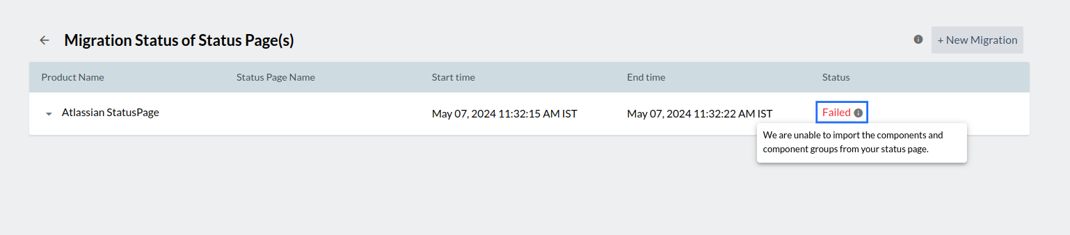 7. Now, you'll find the ongoing migration on the Migration Status of Status Page window. If the migration fails, you can find the reason by hovering over the info icon next to the status of the migration.
