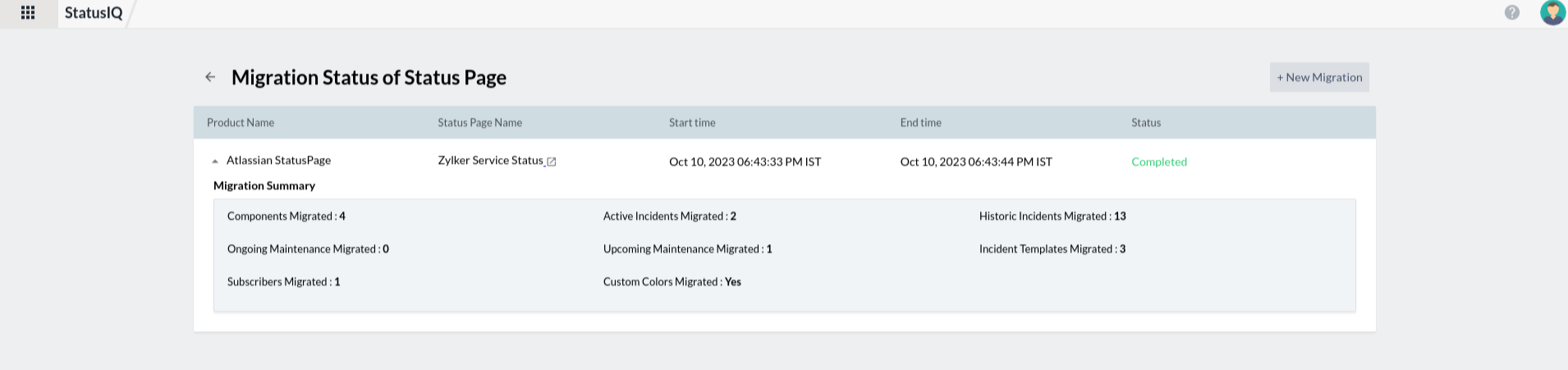 8. To view the migration summary of the status page, you can click any status page listed.