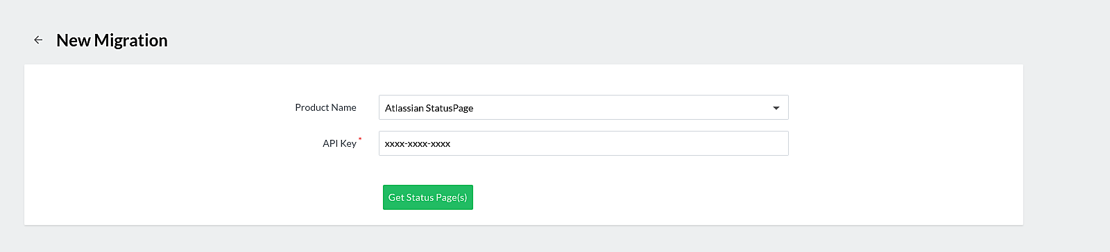 4. In the New Migration page that opens, select the Product Name and provide the API Key of the status pages that you want to be migrated. To get API keys, refer to this help documentation. Click Get Status Page(s) after you've filled in these details.