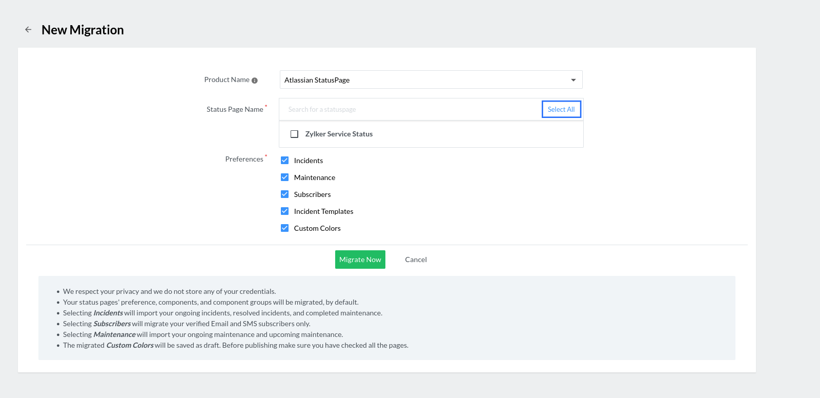 5. Now, a list of status pages present in your Atlassian account will be displayed in the Available Status Page(s) section. You can manually select the status pages you want to be migrated or you can select all the status pages available by clicking Select All.