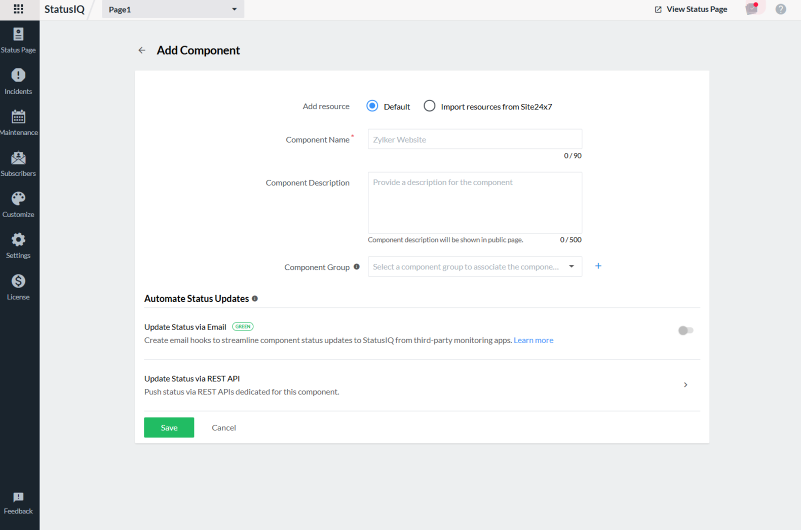 • Automate Status Updates: You can manually change the status of a component as well as enable the automate status updates option if you want to change the status via any other monitoring tools or any in-house monitoring tool.Learn more about status automation.