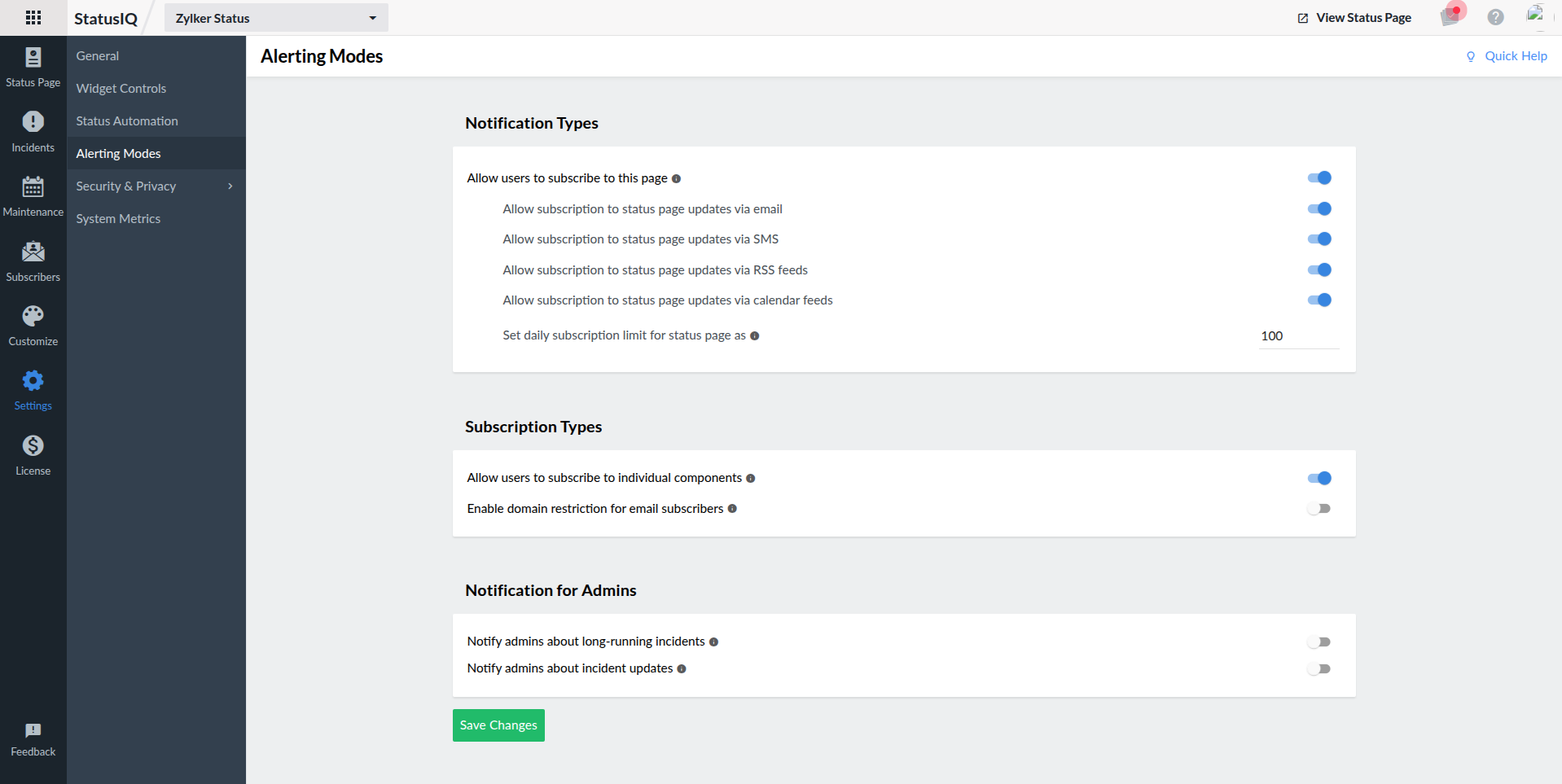 Using this option admins can enable notification types which end users can subscribe to. If the admin do not need any subscribers, then that can be achieved by disabling the toggle button or by enabling the preferred modes alone using respective toggle buttons.