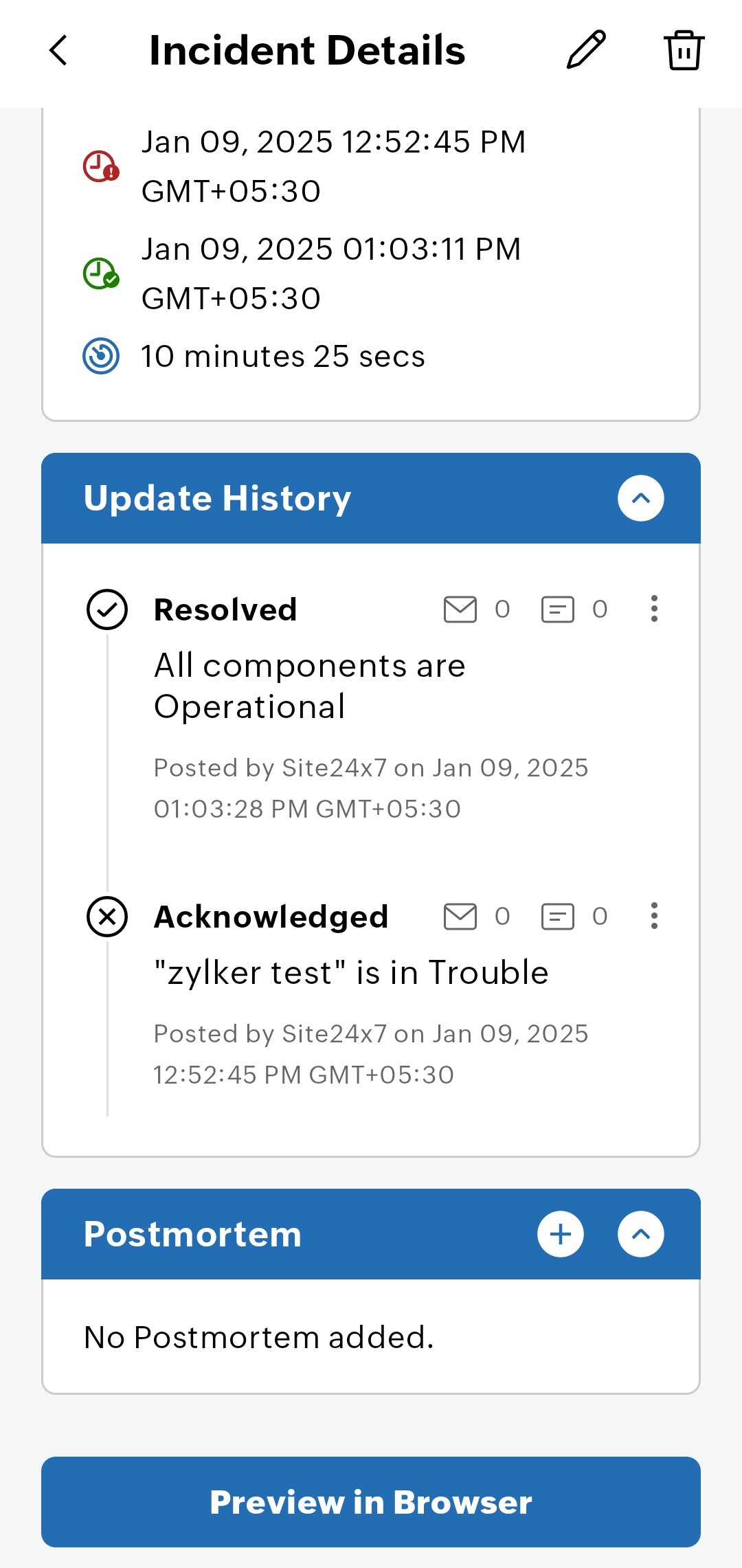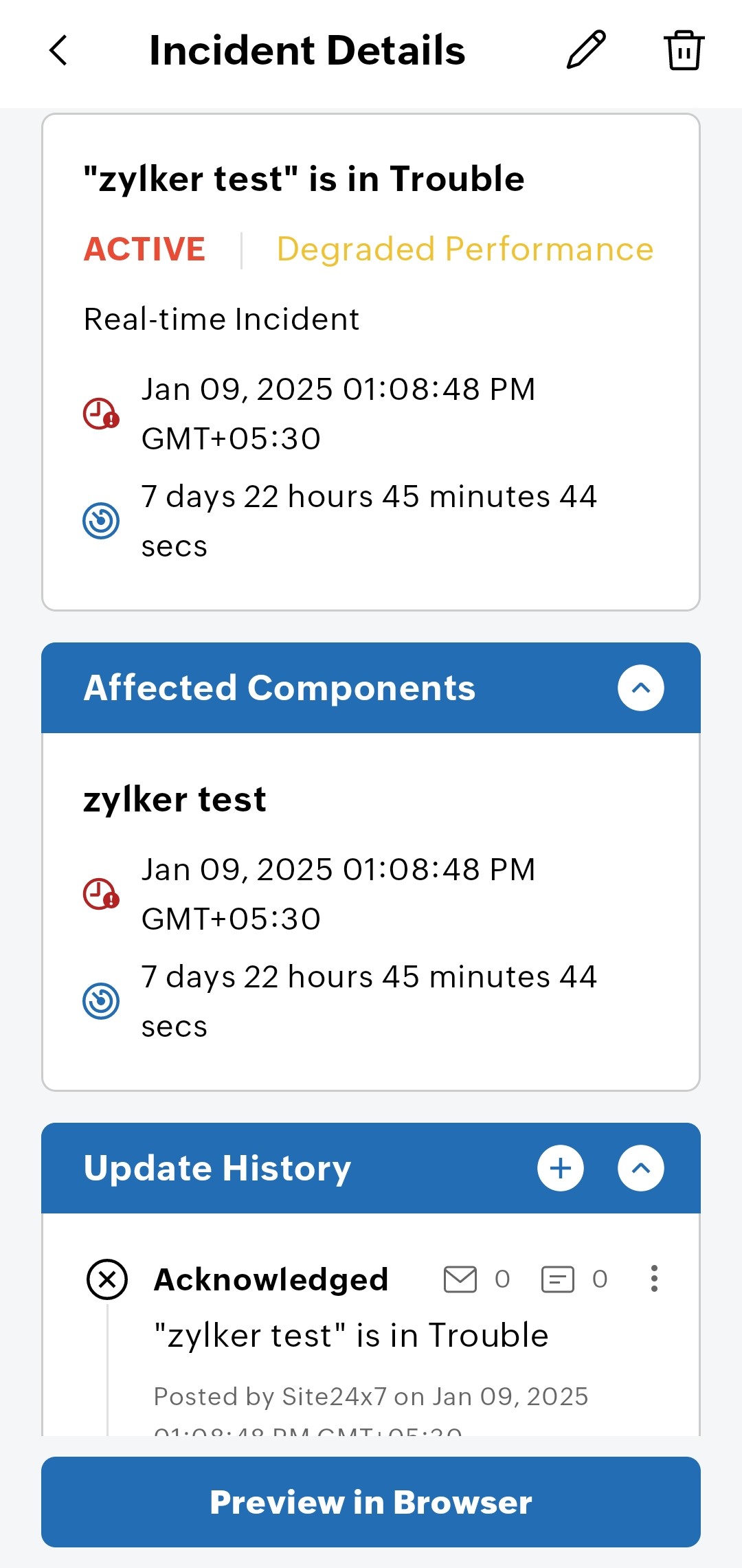 Site24x7's StatusIQ ensures clear and transparent communication by allowing technicians to provide real-time updates on incidents. The StatusIQ mobile app takes this a step further, delivering instant updates directly to your fingertips. Even without access to a laptop or desktop, you can monitor ongoing issues, track progress, and keep your customers informed with continuous updates on your status page just with your mobile device.