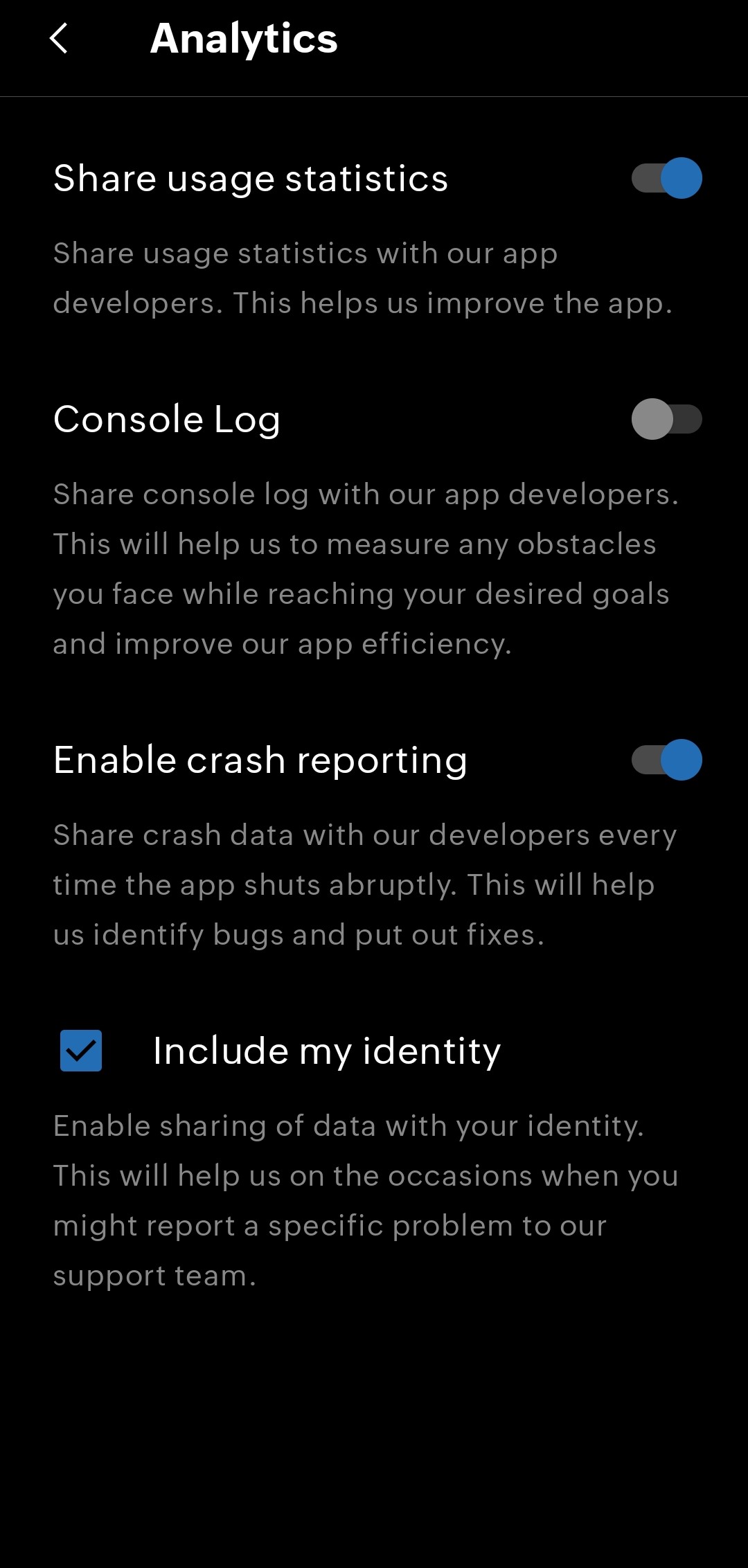 - Include my identity: Enable the app to attach your identity to the data shared with the developers. This helps to identify and fix user-specific issues.