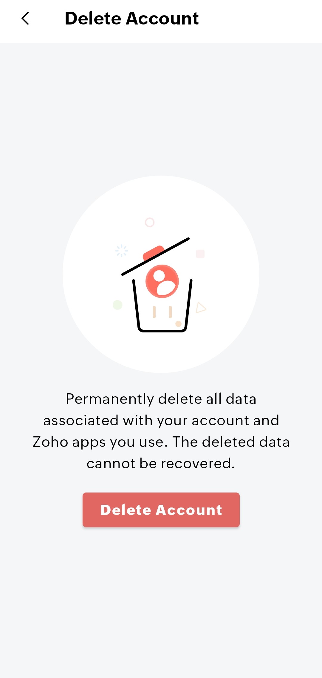 - Click on Delete Account to permanently delete all data associated with your account and Zoho apps that you use.