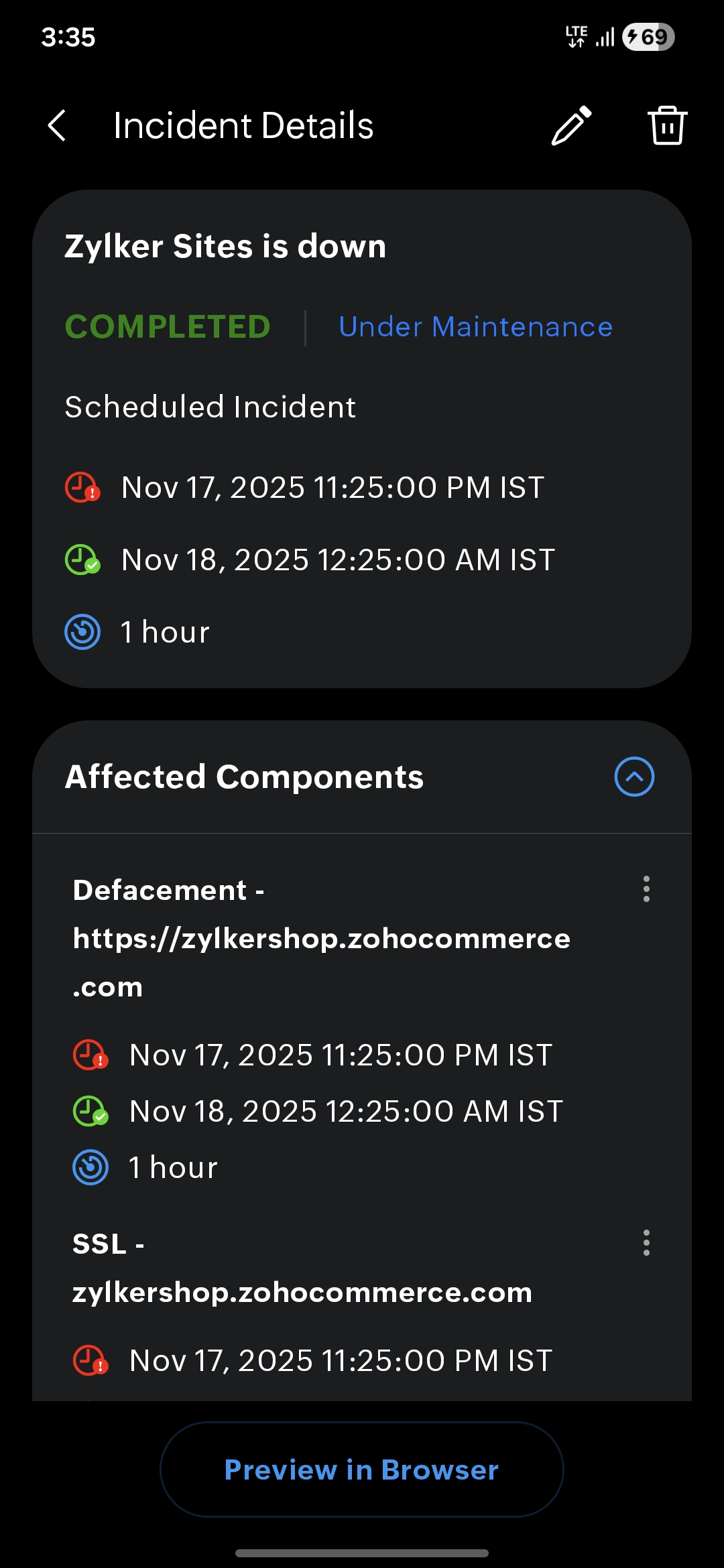 - Edit: Here you can modify Incident Title, Incident Severity, Incident Start Time, Time Zone, and Affected Components.