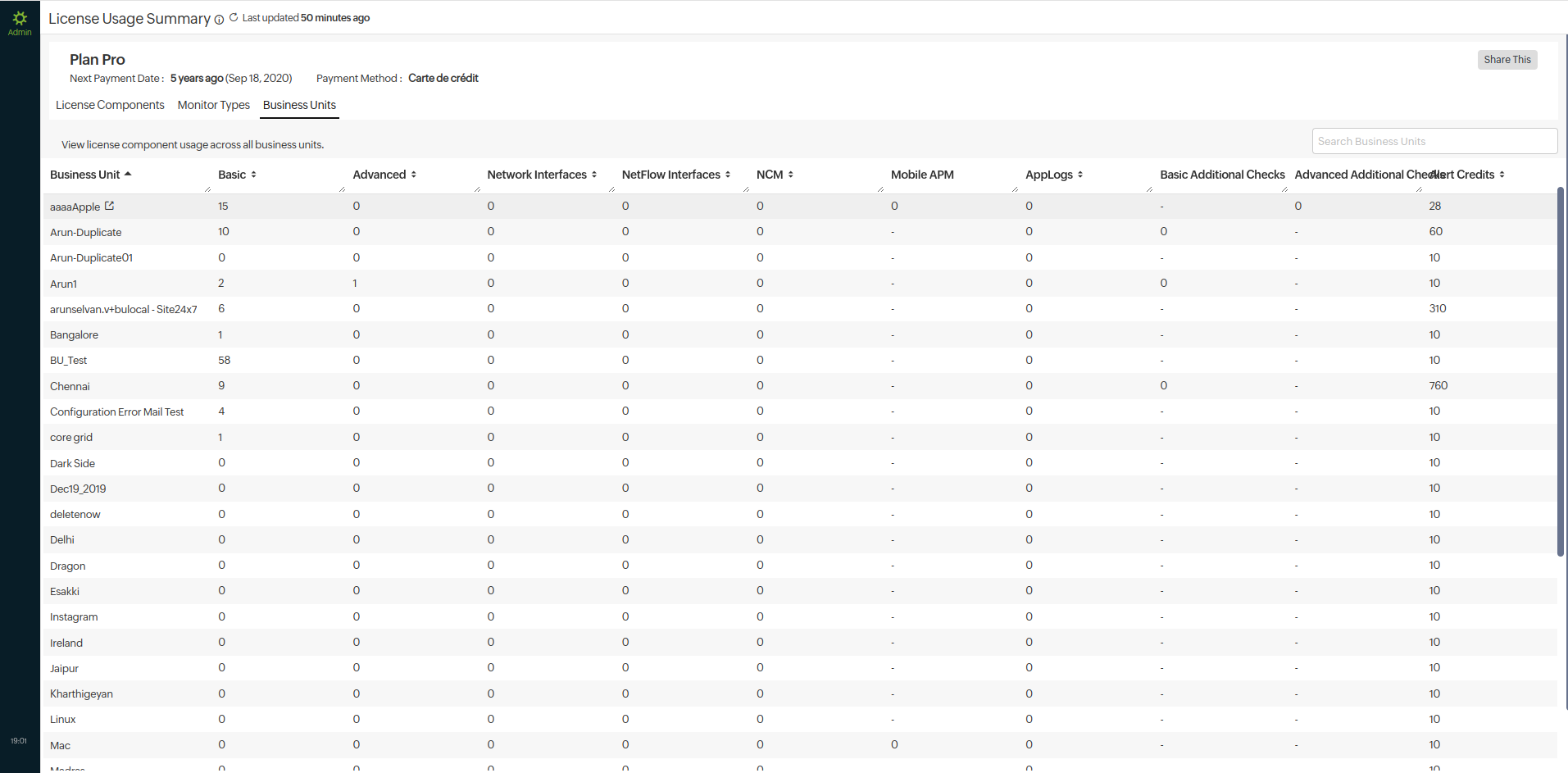 - Business Units: View license component usage across all units. Drill down the details of a specific unit by searching for them through the search tab. Click the appropriate unit's entry to navigate to their accounts.