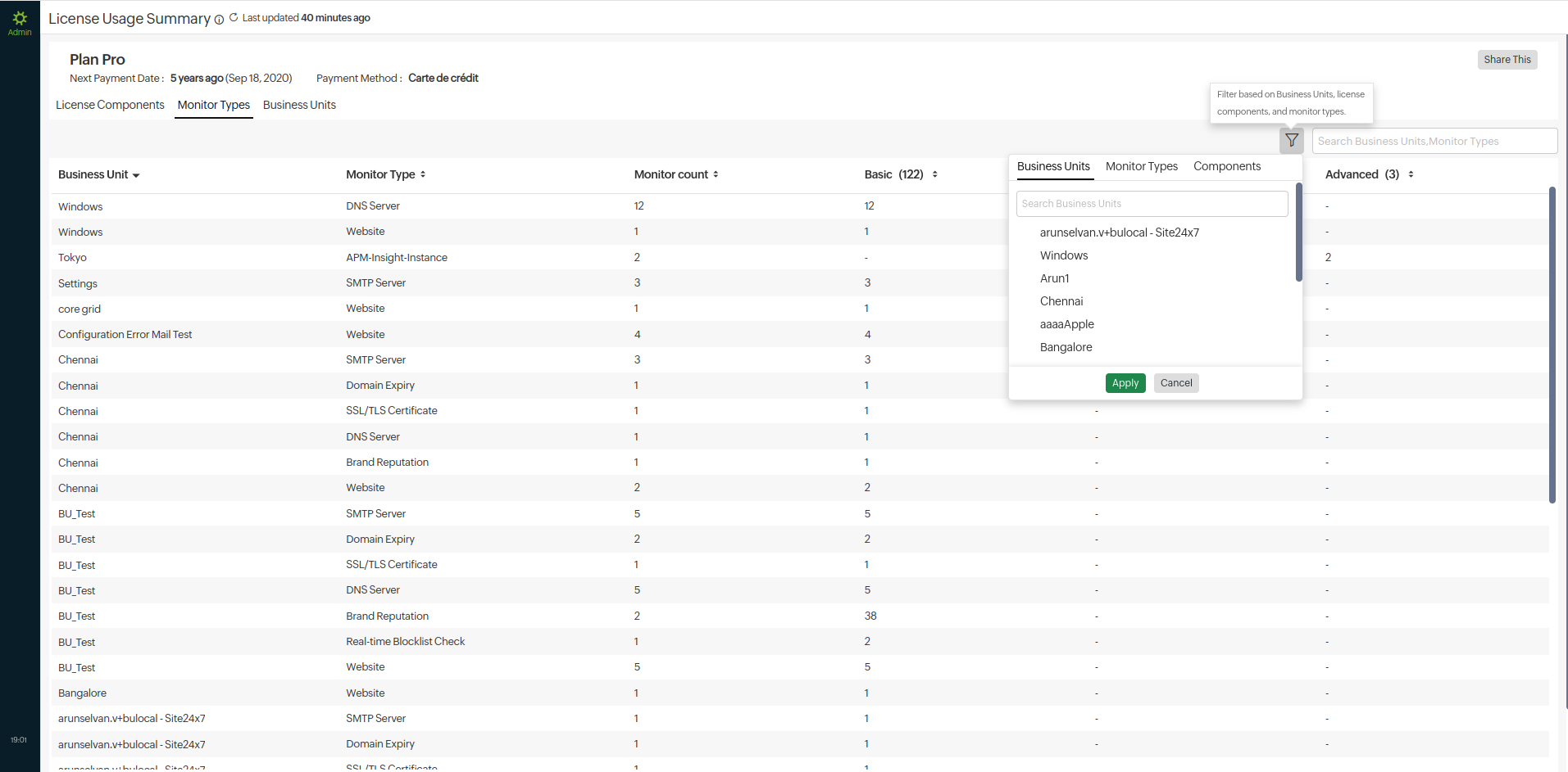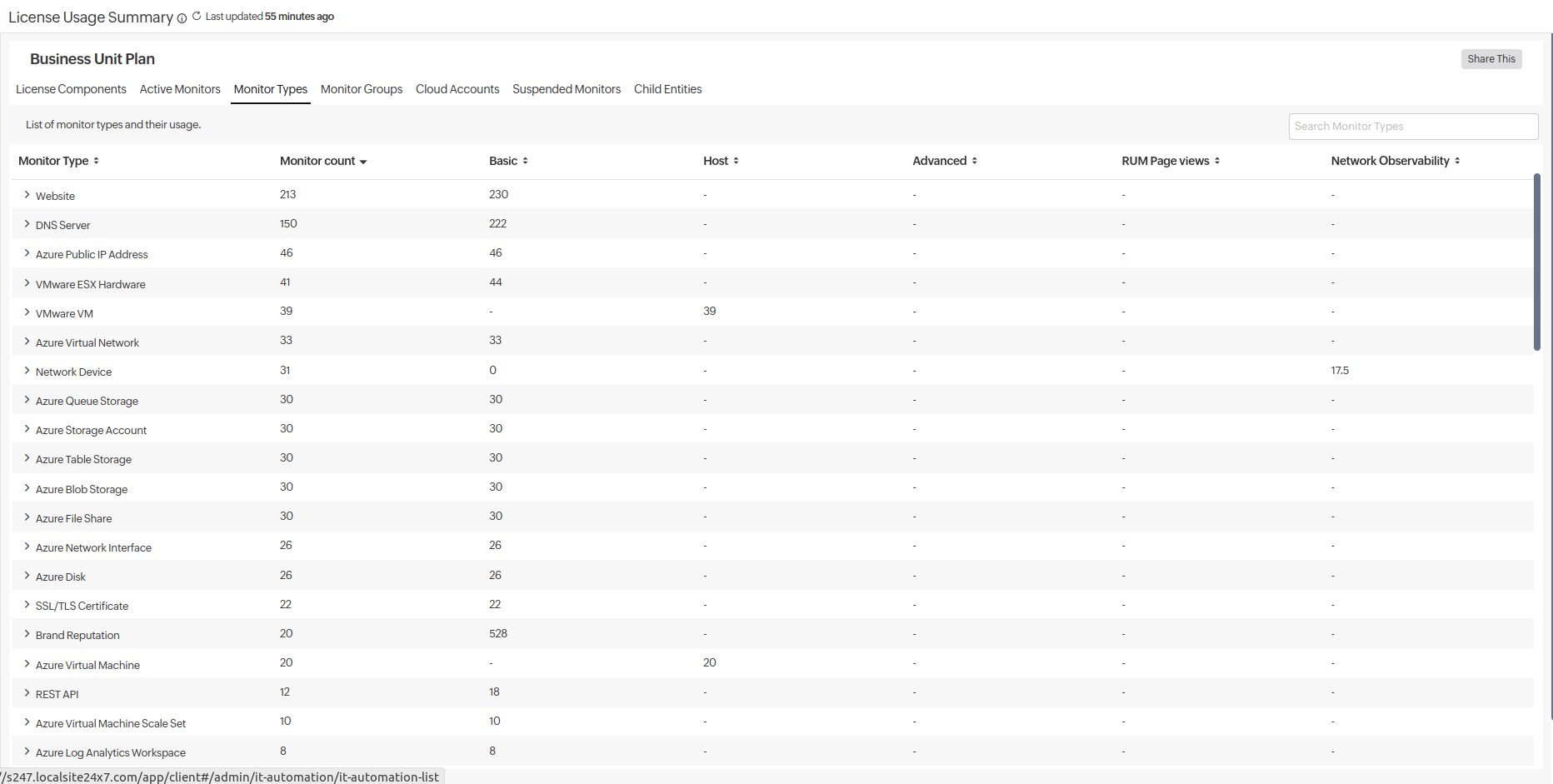 - Monitor Type: View the various types of monitors used by different units, along with their respective counts of licensing component consumption. Click the listed units to navigate to their accounts. To filter the view:
