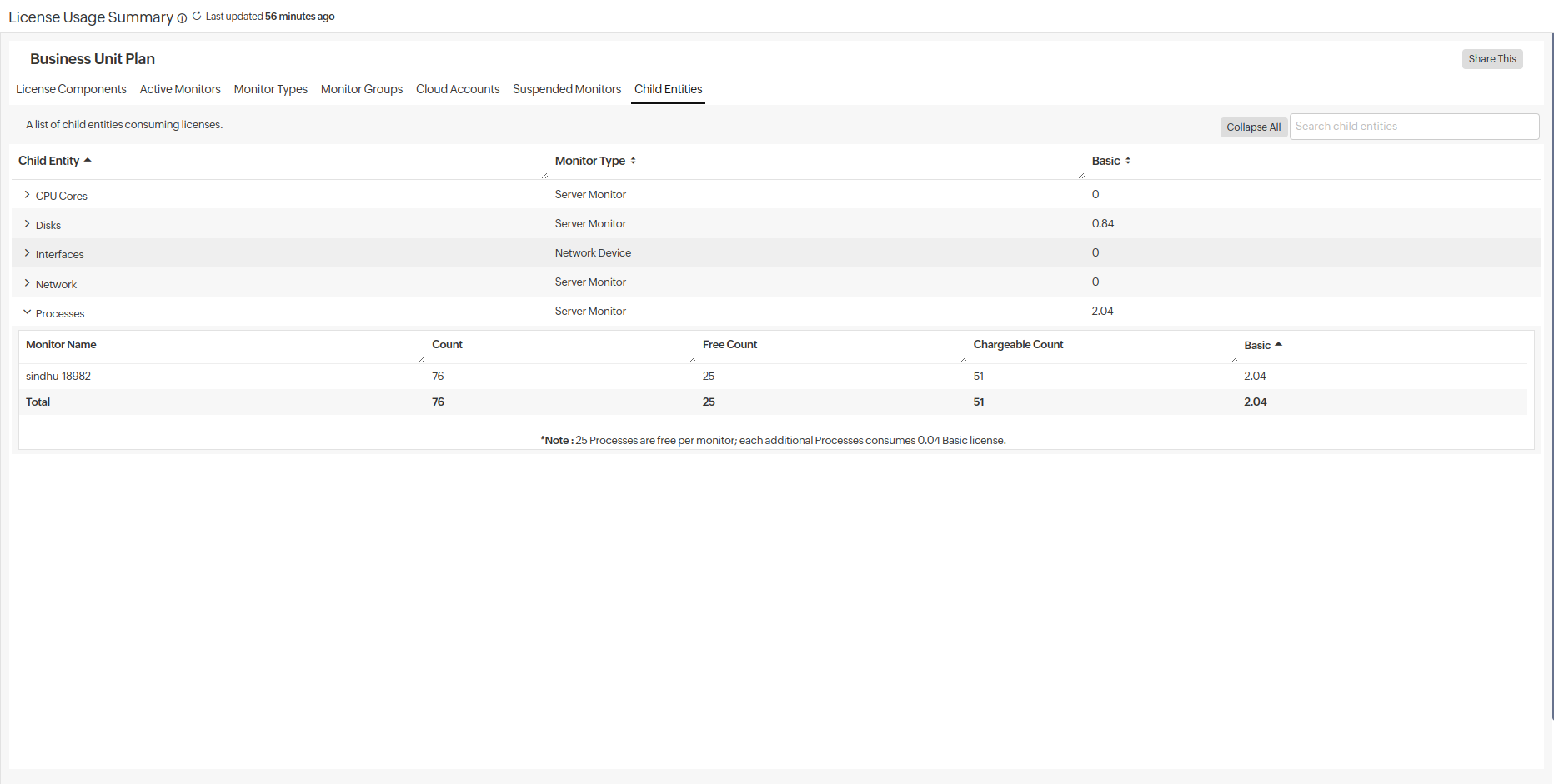 - Child Entities: Drill down to view the license consumption of each monitor compared to its respective child usage.