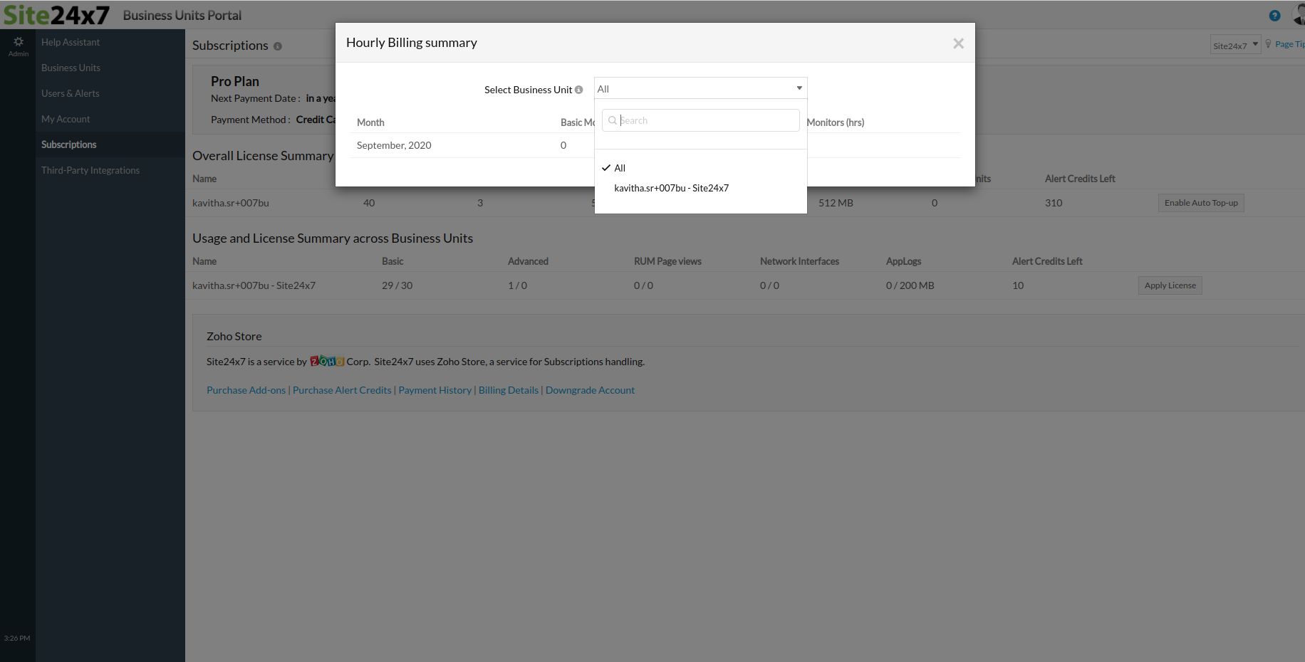 Site24x7's subscription model has a unique concept of Basic monitors, Host monitors, and Advanced monitors, based on the type of monitors. It offers a set of Basic monitors, Host monitors, Advanced monitors, RUM Pageviews, Network Component, and AppLogs along with it. You must have a Enterprise 2024 paid plan in Site24x7 to enable Business Units. After enabling Business Units, monitors from your previous plan gets migrated automatically to Business Units. Since Business Units allow a multi-tenancy setup, and monitors can be purchased and distributed among the different Business Units from a single console. You can further top-up your plan by purchasing additional add-ons. It must be noted that your current Site24x7 account gets auto-added as the default Business Unit in Business Units portal. However, every new Business Unit will be charged $9/Business Unit per month (when billed annually) or $10/Business Unit per month. You can purchase the Business Units add-on from stores. We support payment via Credit Card, Paypal and Purchase Order. All payments via Credit Card or PayPal will be auto renewed based on the payment duration opted by you. For additional payment-related information, refer here.