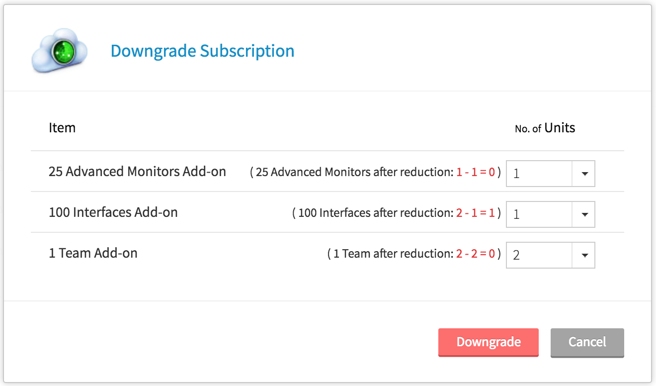 - Verify your add-on count and click Downgrade to downgrade your monitoring add-ons.