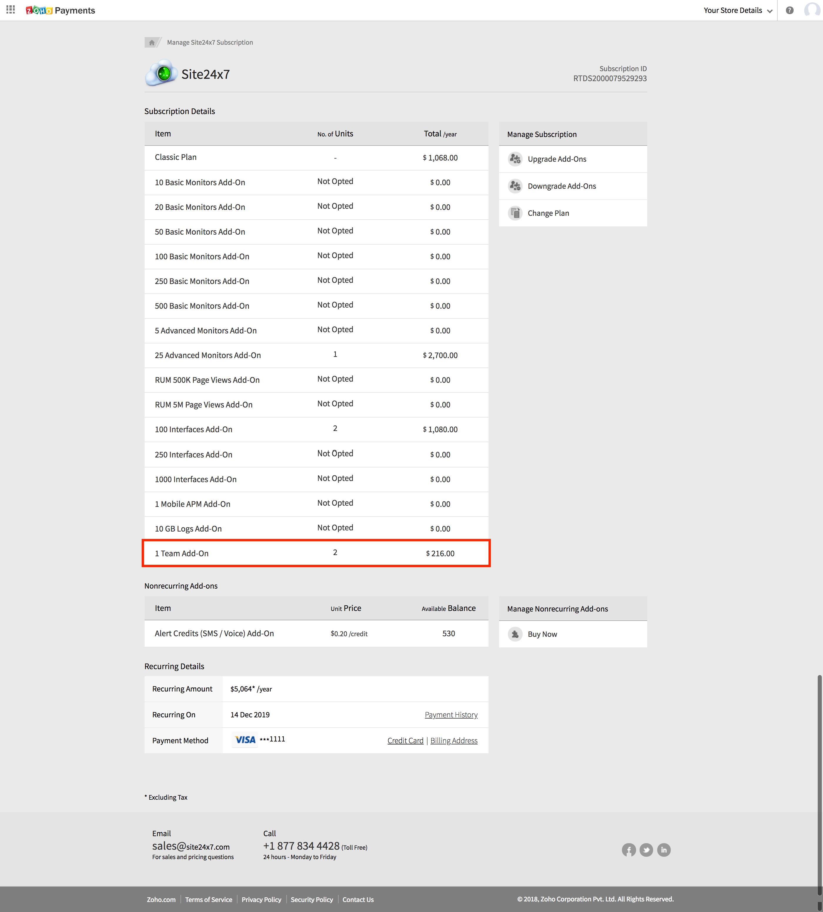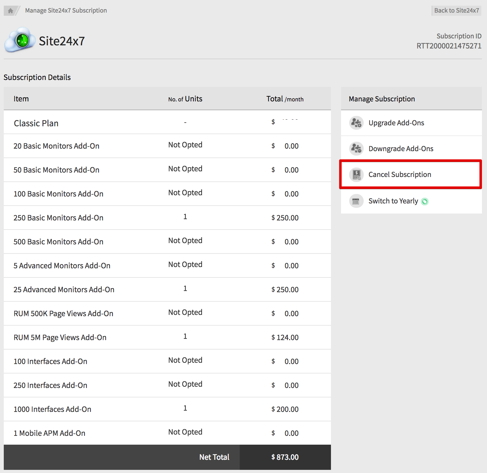- This will navigate you to Manage Site24x7 Subscription window. Here you can Upgrade/Downgrade your addons.